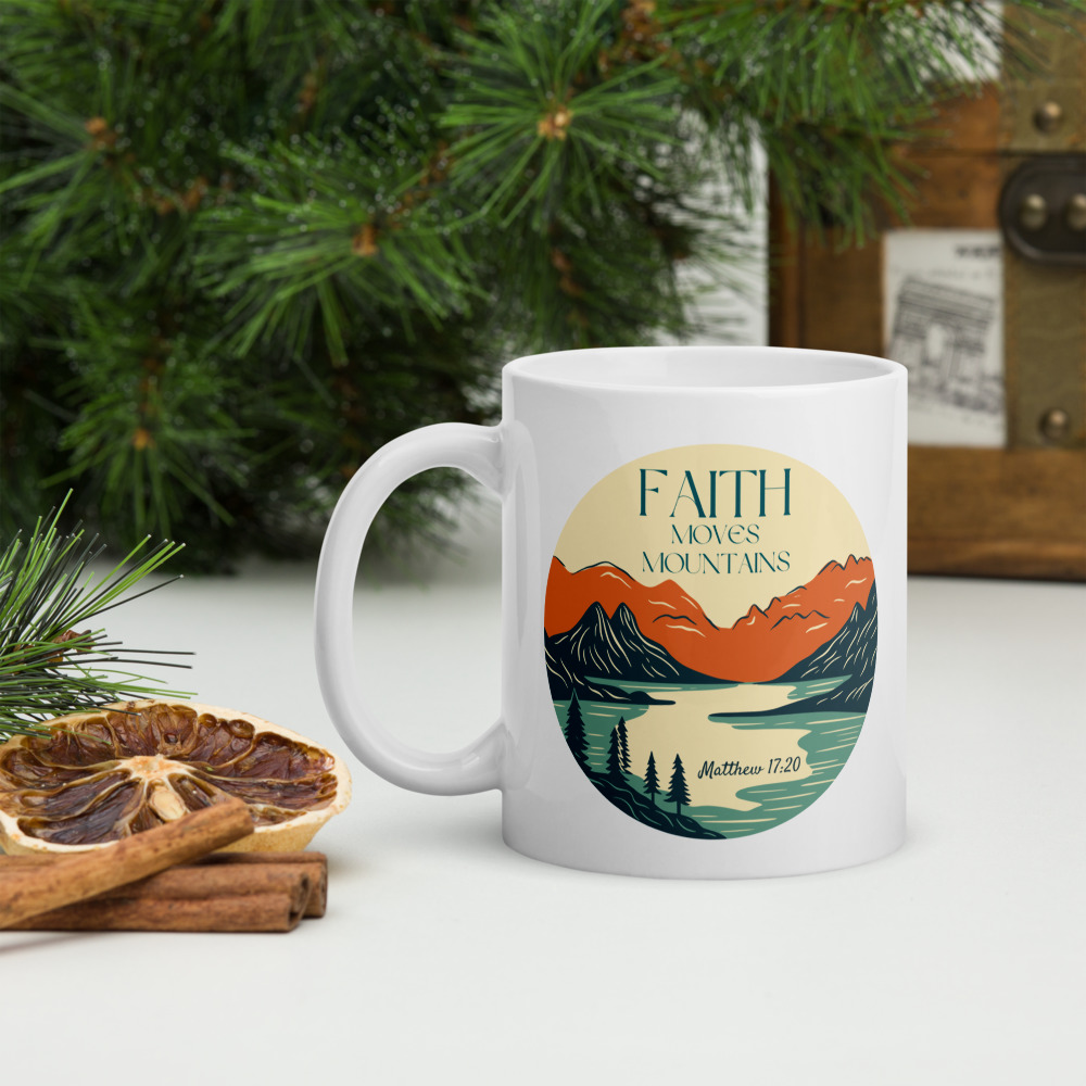 Faith Moves Mountains White glossy mug